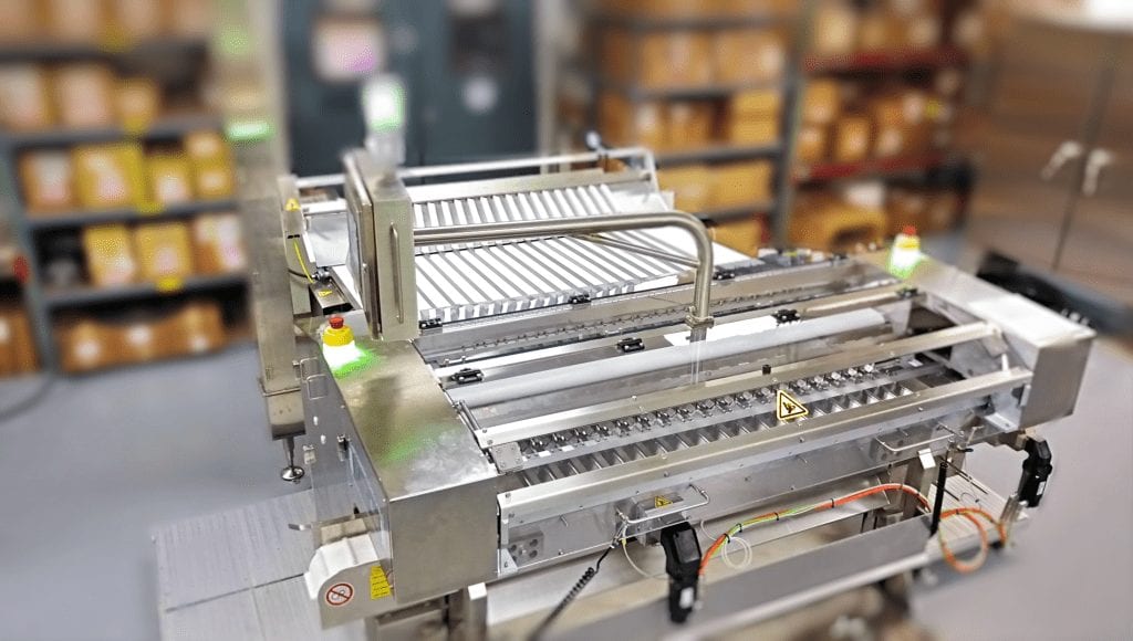 The empty trays are automatically denested from a magazine and placed into a flighted transfer conveyor.