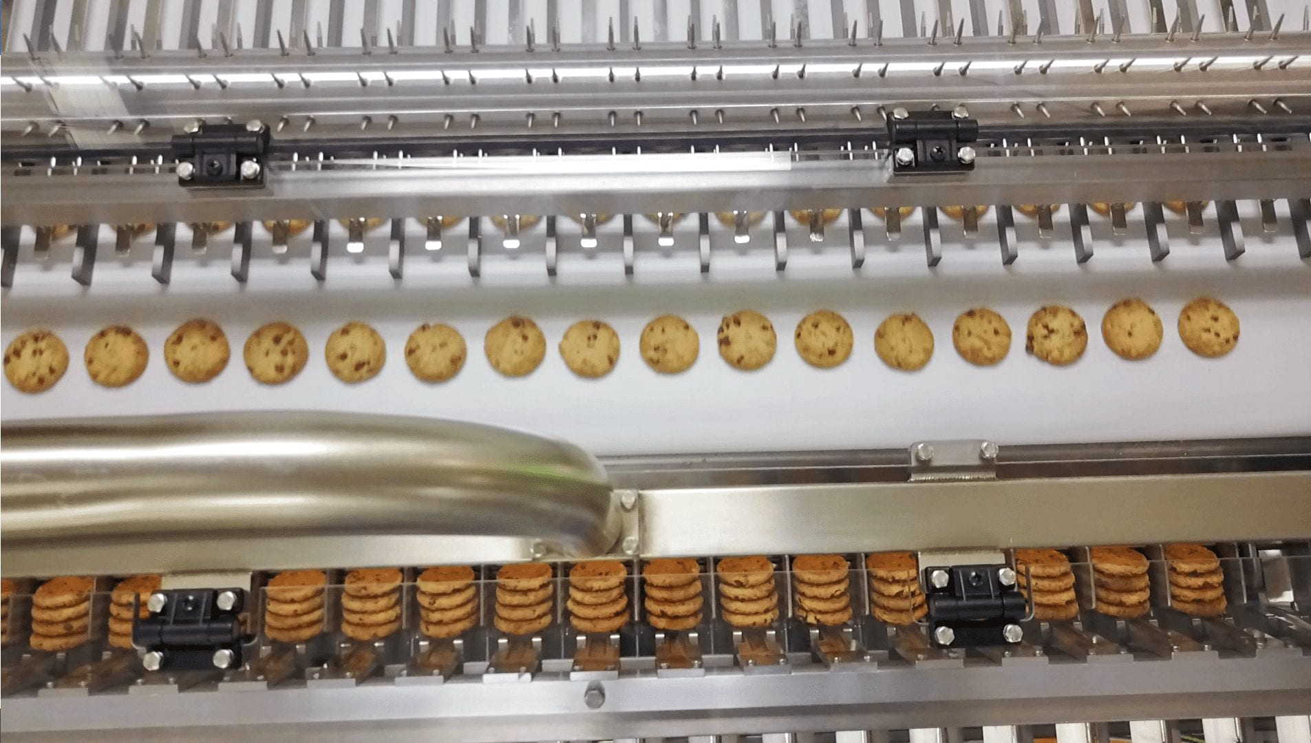 The tray and product conveyors are both on a declined angle to create the maximum parameters for efficient transfer of the biscuits into the tray cells.